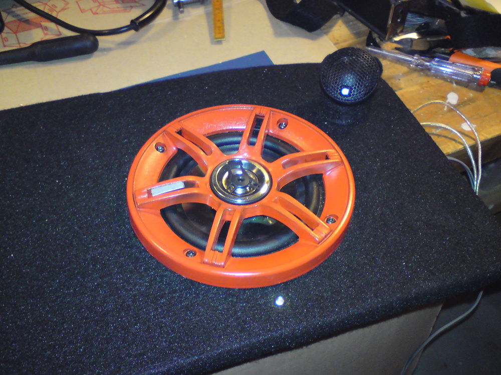 Færdig projekt.. Og så lidt røde dioder.. Færdigt projekt.. Færdigt, så skal den bare lige monteres..hehe Larkerede højtaller plus rainbears diskanter.. Første diskant monteret.. Så manglede der kun 1 igen.. Inden diskanterne blev monteret.. Cute rainbears.. (Rainbow diskanter) Rainbear (Rainbow diskant) Rainbear.. (Rainbow diskanter) Lige hvordan den ser ud på bunden.. Bunden af hattehylden med en crossover fra Rainbow.. Helt fra bunden.. Så er dioderne sat i.. Nu mangler dioderne, højttallerne og diskanterne at blive monteret.. Så blev begge huller lavet.. Første hul er færdig.. Så er det næste hul.. Sådan ser MDF pladen ud efter vi fik skåret den til og lavet hul til højttalerne..